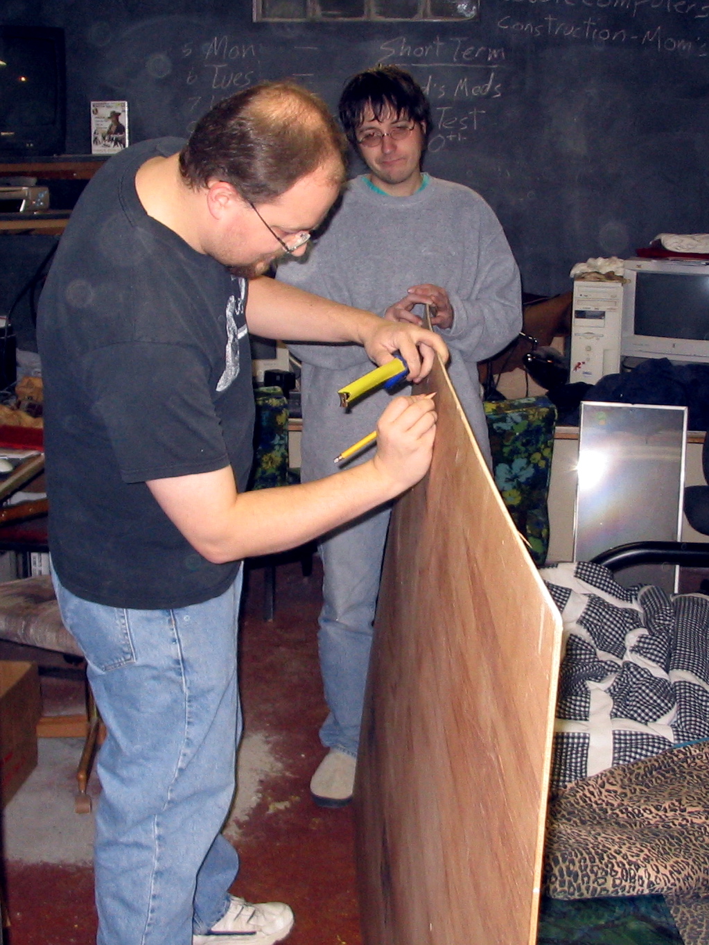 Dale helping me measure the back panel for the shelves