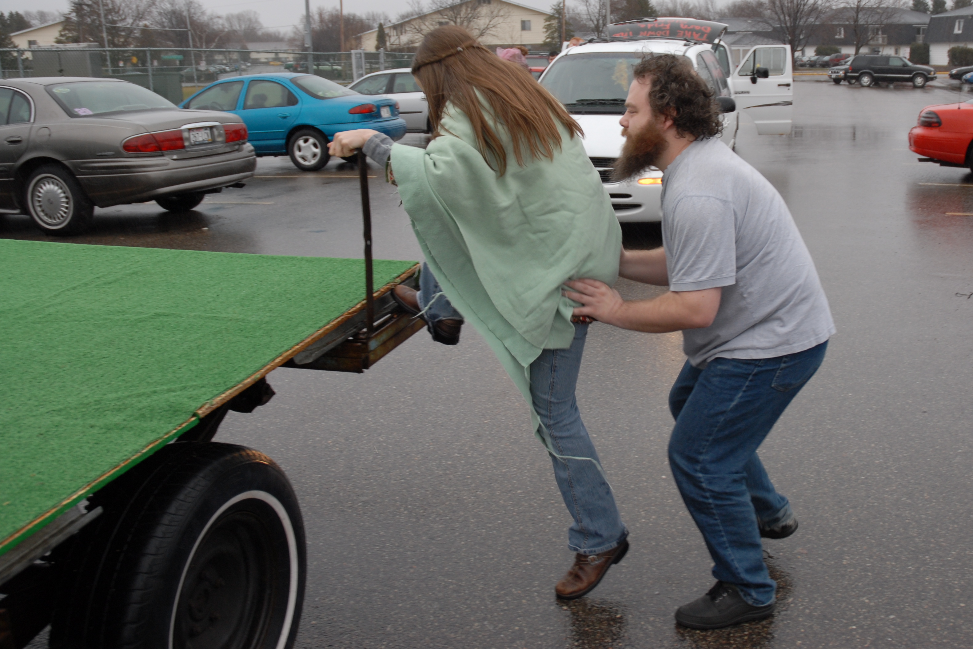 Pat thoughtfully helping his fiancee onto the float