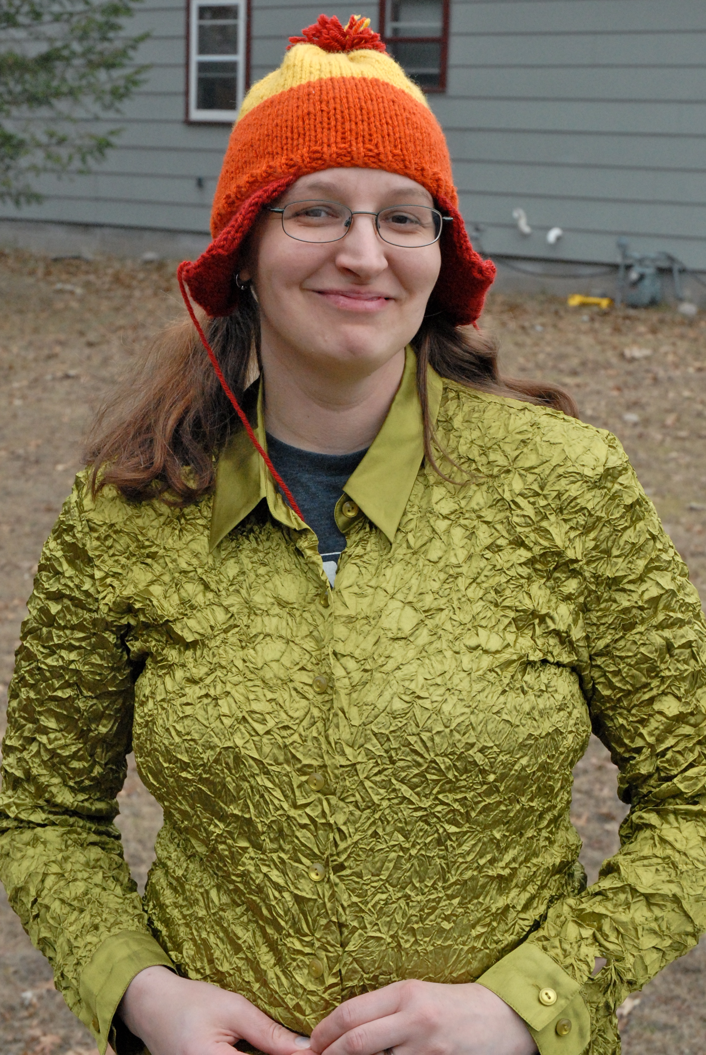 Dawn in her Jayne hat and strangely crinkly shirt